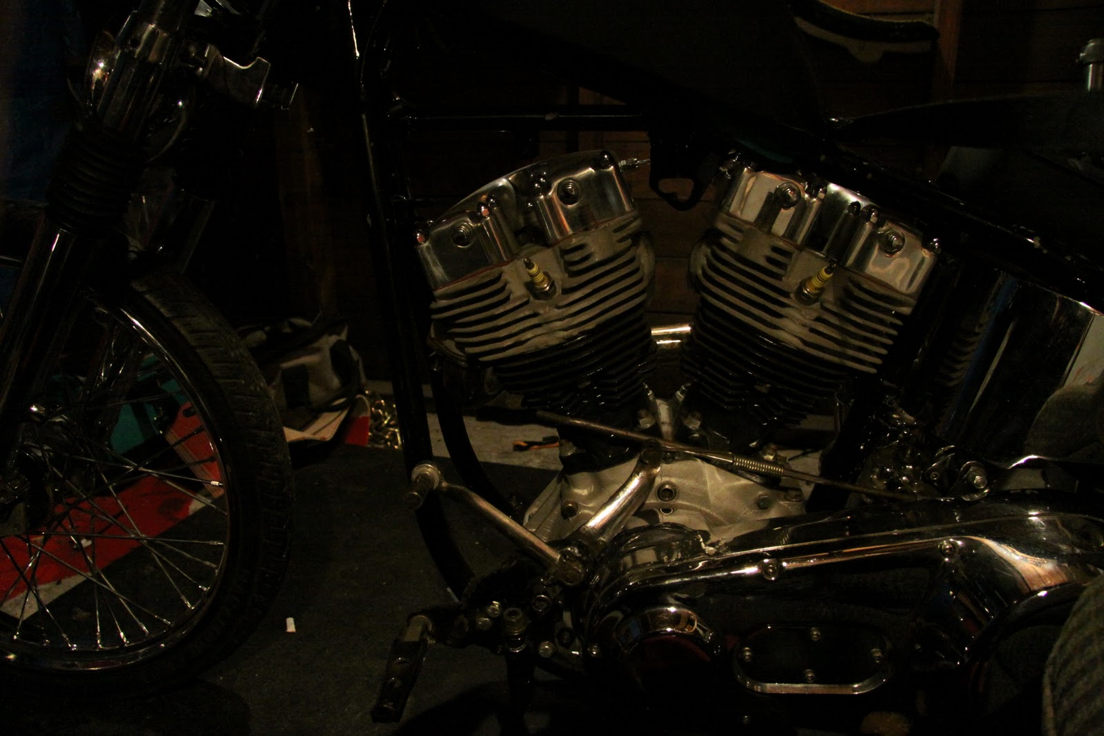 Stopped in at Mikes man cave tonight to check out the new shovel that he picked up., fresh motor/trans, looks like a good start. He's been playin around with mock up, then onto oil lines and wiring and he'll be racking up the tickets in no time!!